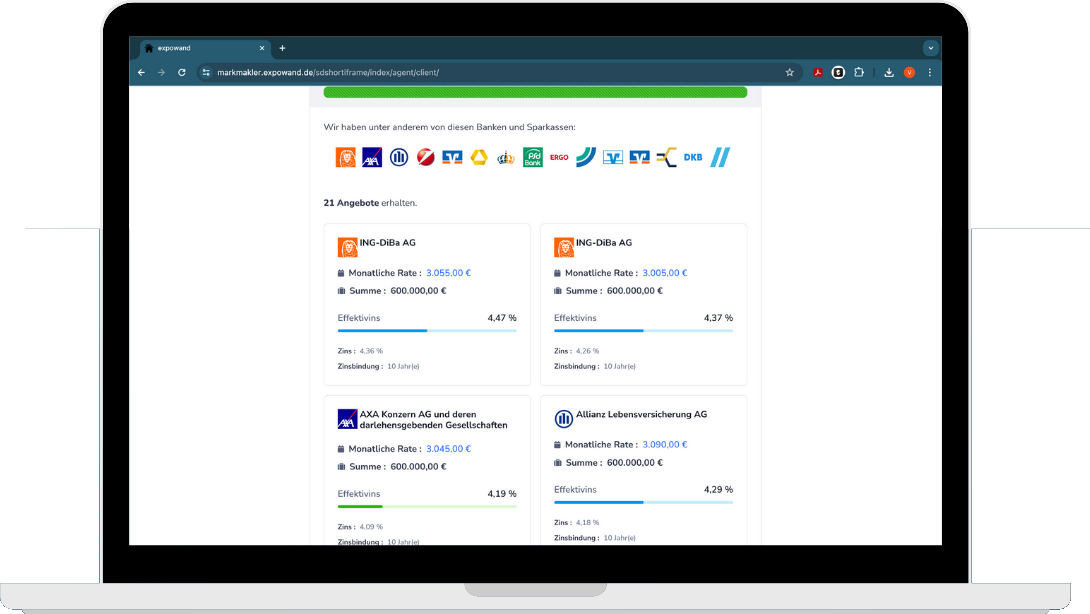 • Zugriff auf Zinsvergleich, Selbstauskunft, Suchauftrag, freigegebene Angebote und Finanzierungszertifikat